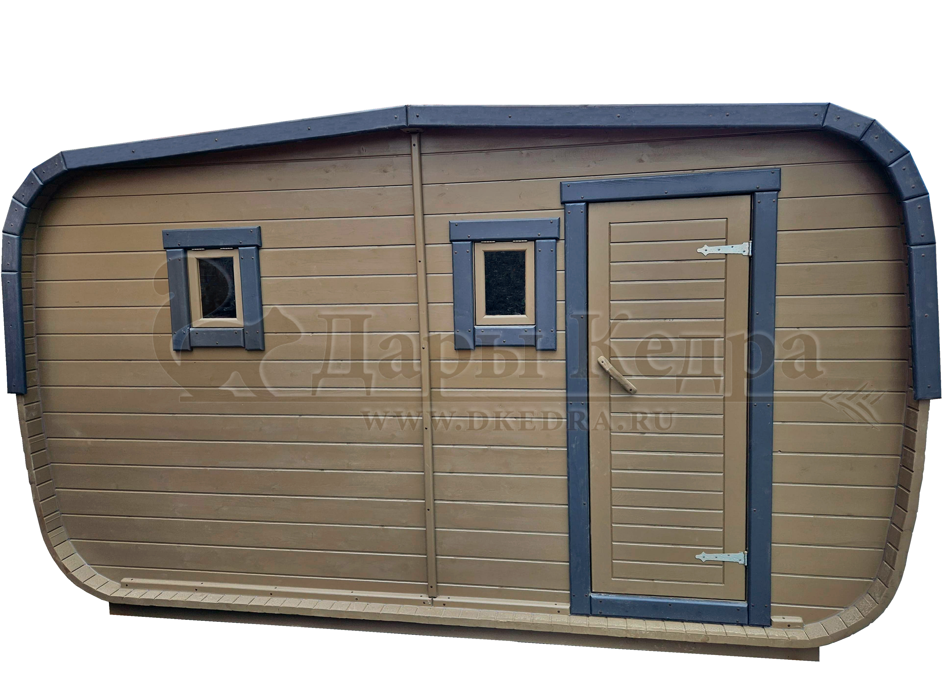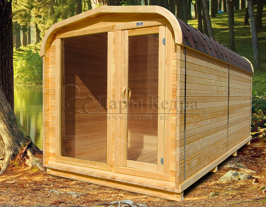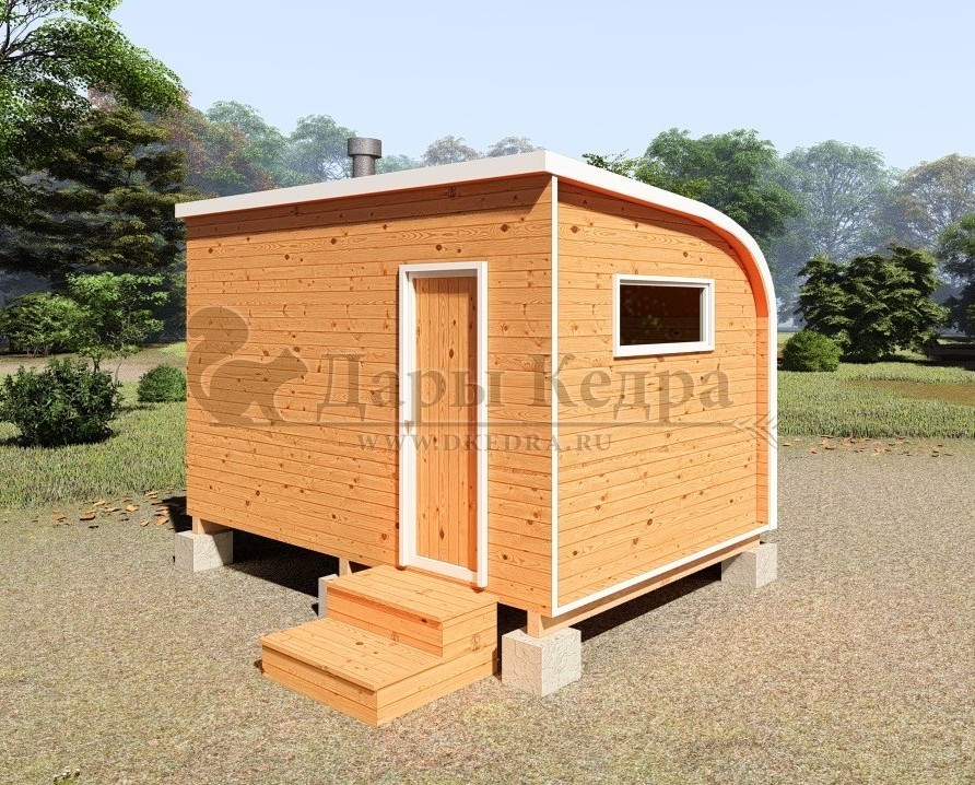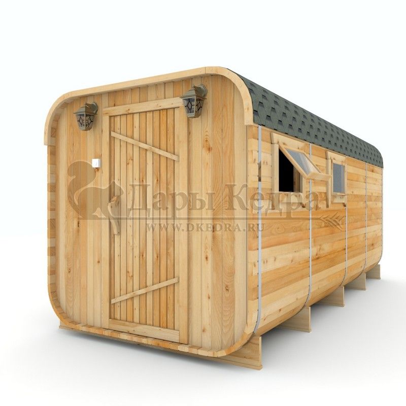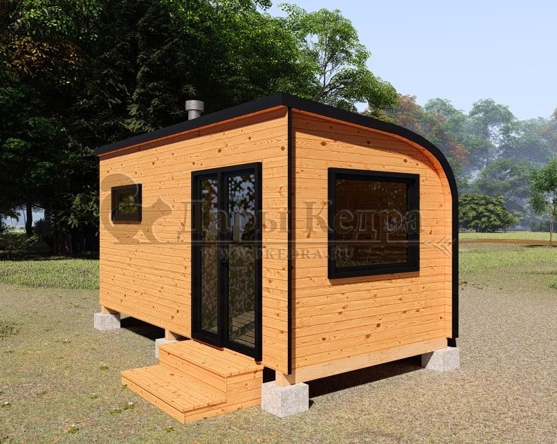 Симбиоз круглой и квадратной бани-бочки. Разработано с учётом эргономики, в ней так же просторно, как и в квадро-бочке, но при этом полукруглая крыша не дает задерживаться снегу и влаге на кровле. А еще такая баня безусловно красивая, мобильная и доступная каждому!