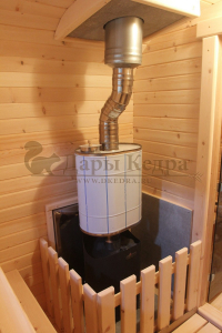 Печь может быть установлена в угол парной. Эта опция включена в стоимость установки Г-образного полка. Имеет угловую защиту двух стен и потолка, а также усиленный мастер-флеш на крыше. В стандарте печь идет с внутренней загрузкой. Установка печи с внешней загрузкой оплачивается дополнительно.