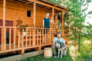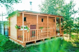 Это классическая прямоугольная модель бани с тремя отделениями: предбанником, моечной и парилкой. Для удобства пользования предбанник оснащен лавочкой и вешалкой. В моечной находится лавка и полочка из кедра. Парилка оборудована двухуровневым открытым полком и печью. Время растопки такой бани не превышает 30 минут. На просторной веранде можно оставить вещи или отдохнуть после парения. Каркасно-щитовую баню можно заказать как в готовом, так и в разборном варианте. В разборной модели готовые щиты из кедра быстро собираются в полноценное строение, что также позволяет исключить лишний строительный мусор. Такая баня не требует полноценный фундамент, поэтому при необходимости ее можно перенести в другое место.