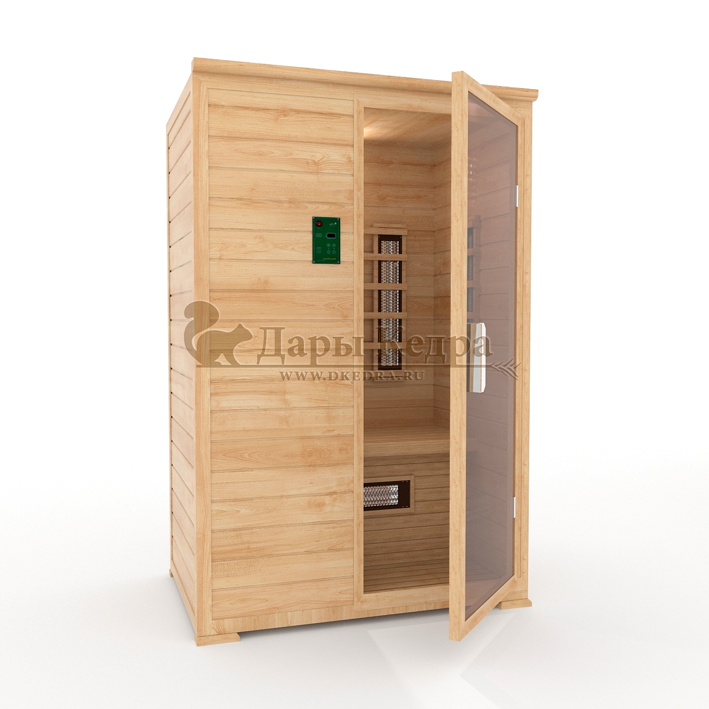 Это специально оборудованная кедровая кабина для прогрева тела человека сухим теплом. Воздух в таких парных не нагревается. Инфракрасные лучи воздействуют на тело, равномерно прогревая мышцы, суставы и органы. Керамические излучатели похожи на лампы, имеют высокую температуру нагрева, поэтому защищены противоожоговыми решетками. Тело человека в таких саунах нагревается интенсивнее. Работает кабина за счет электричества. Двухместная инфракрасная сауна с керамическими излучателями подойдет как для домашнего использования, так и для коммерции.