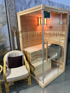 Это специально оборудованная готовая деревянная кабина для сухого и влажного парения. Электропечь нагревает пространство внутри и позволяет сбрызгивать камни водой, слегка увлажняя воздух. Такая процедура позволяет избежать перегрева. Каркас сауны выполнен из массива кедра, снаружи и внутри обшит липовой вагонкой сорта «Экстра» и имеет теплоизоляционный слой. Также двухуровневый полок идёт из кедра для обогащения внутри кабины полезными фитонцидами, а в сочетании с противовирусными свойствами липы сауна становится настоящим источником здоровья.