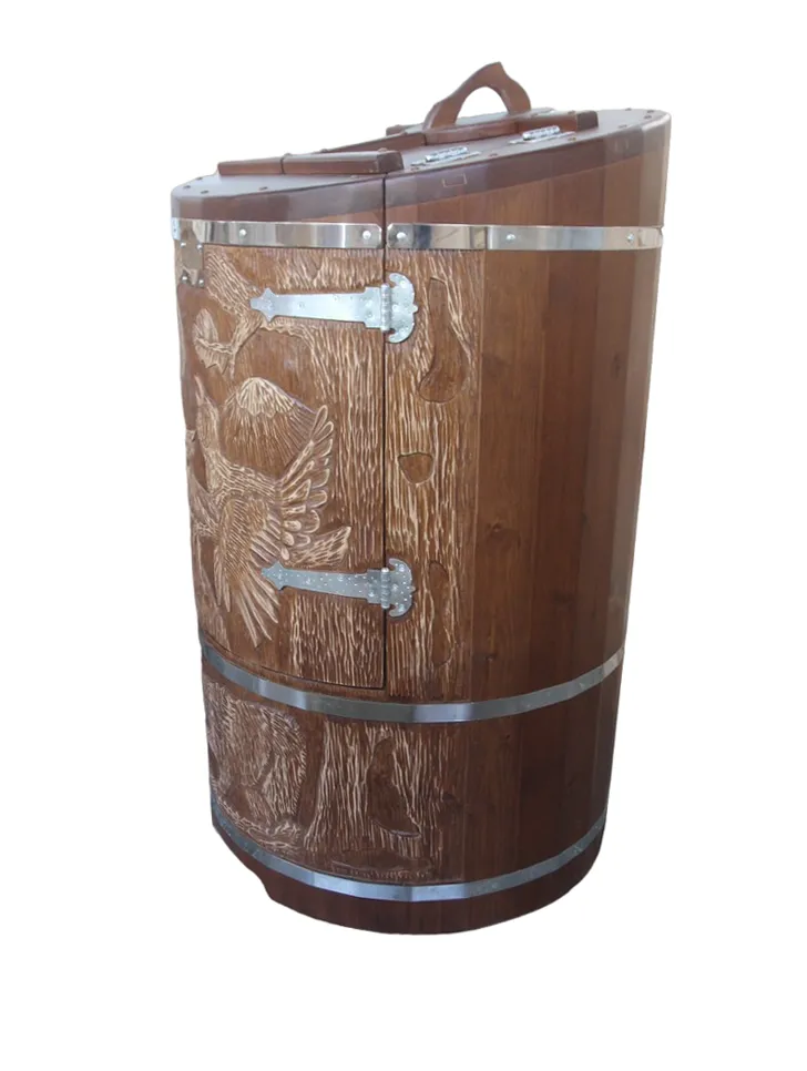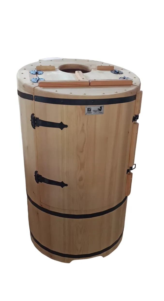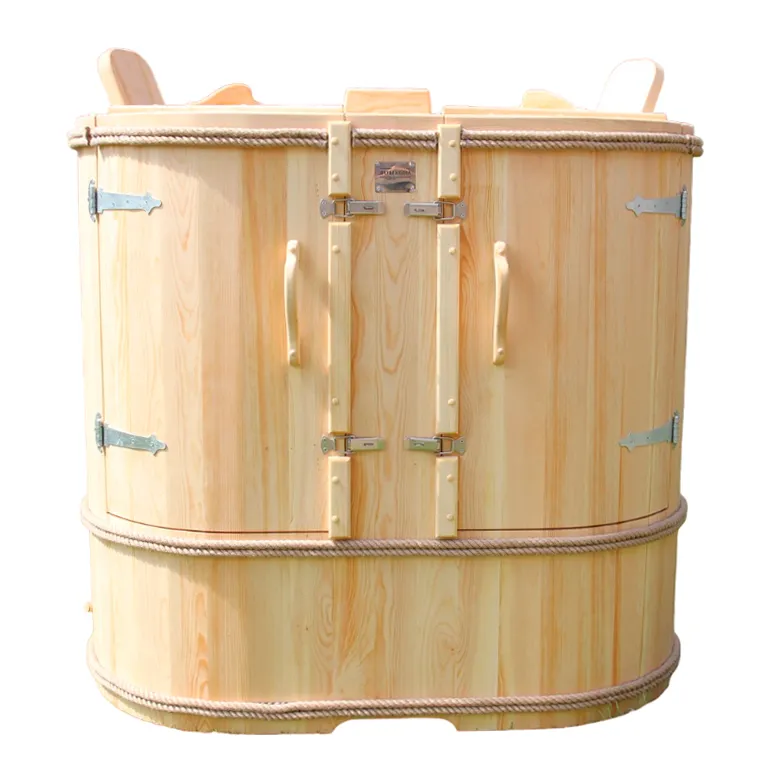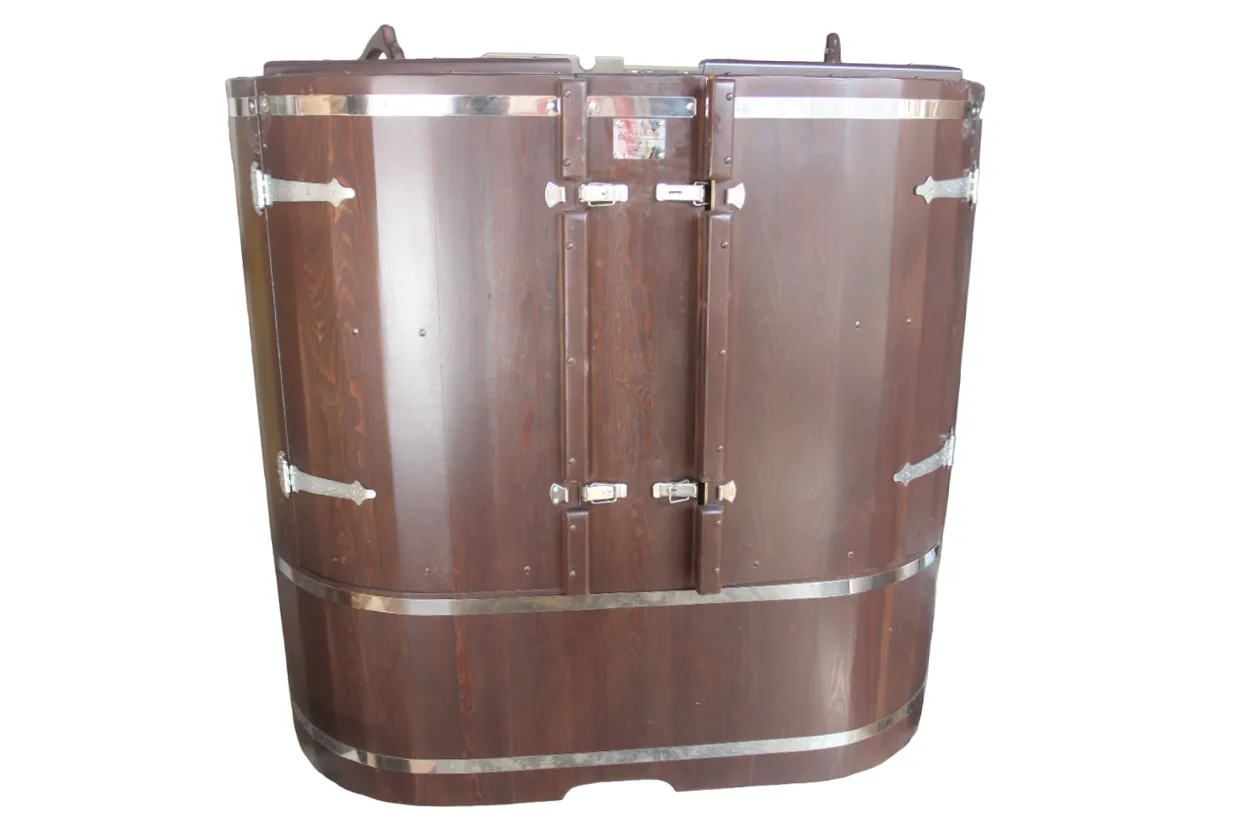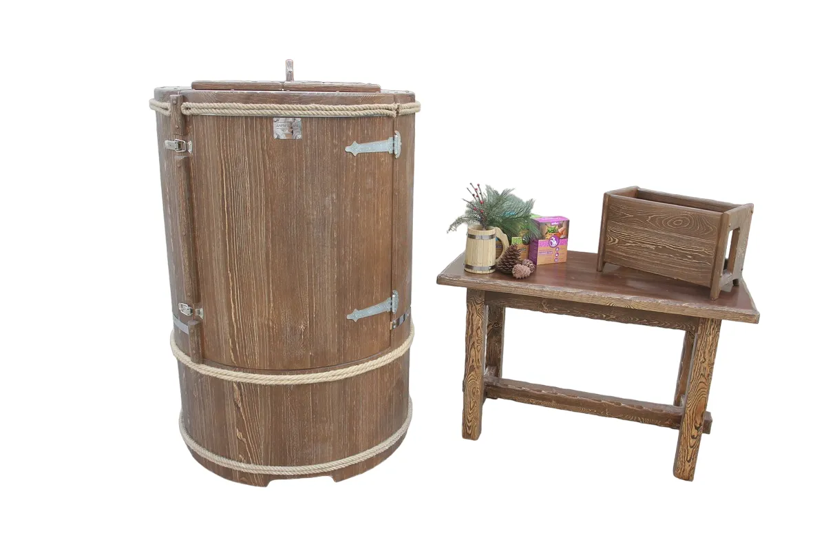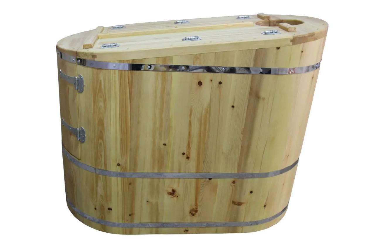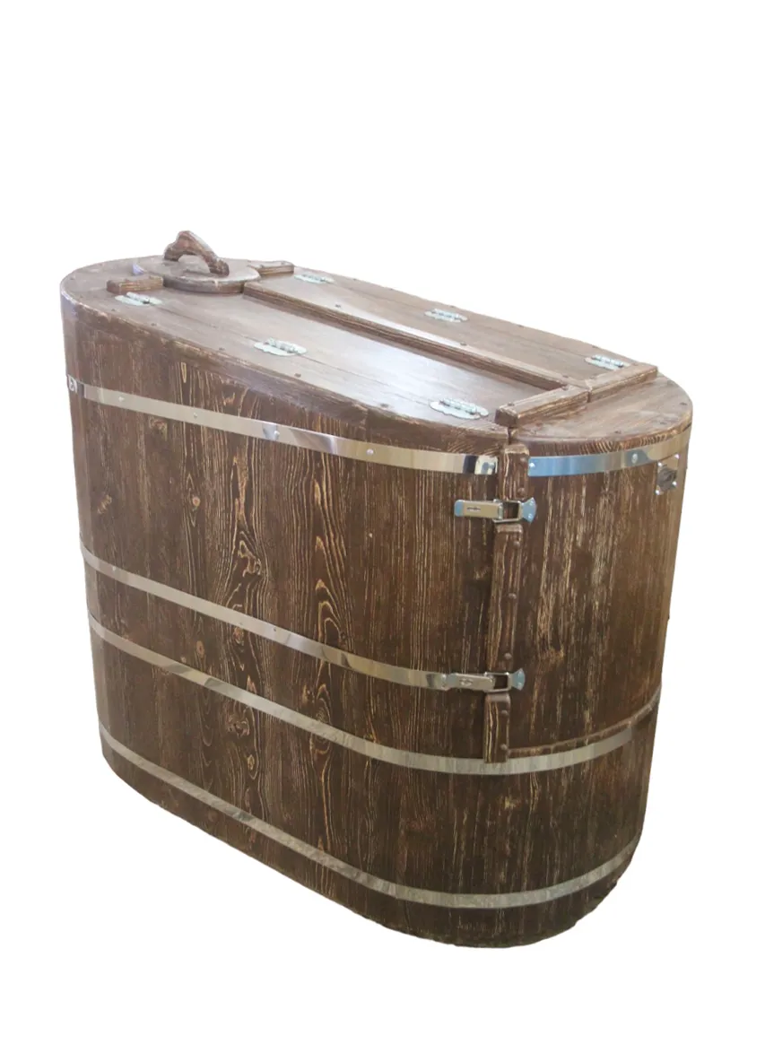 Фитобочка горизонтальная из кедра наиболее комфортна в использовании, потому что во время процедур человек принимает лежачее положение. Она оснащена откидной дверцей, которая во время открывания хорошо держится за счет джутовых веревок. Внутренняя ручка из кедра облегчает открывание и закрывании двери во время использования. Такая модель подходит для оздоровительных центров.