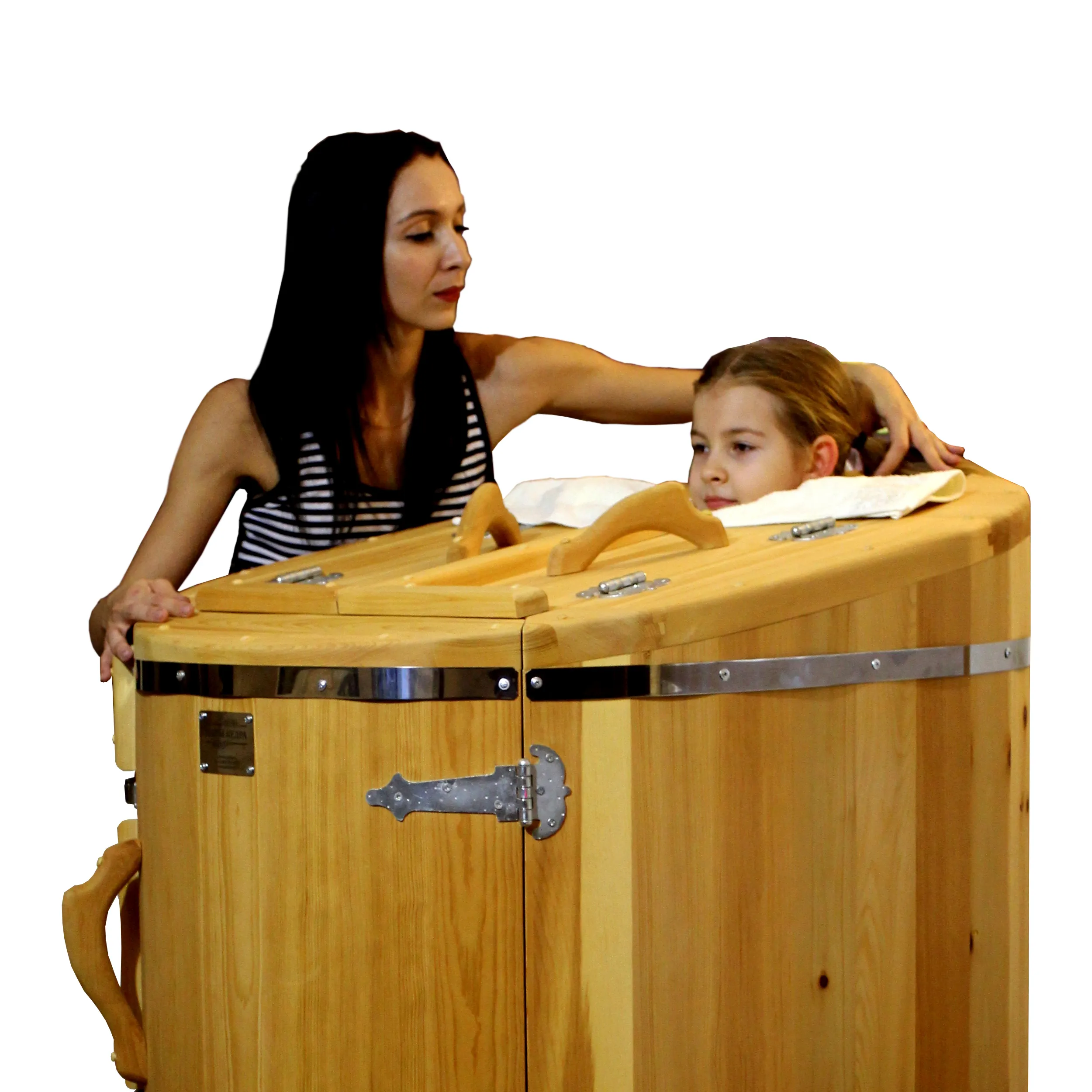Квадратная фитобочка из кедра - это мини парная, которую можно использовать не только в спа-салонах, но и дома. Толщина стенок составляет 40-45 мм, что позволяет увеличить срок службы изделия. Откидная дверь бочки во время открывания фиксируется внешней подставкой - опорой, которая в закрытом состоянии складывается и не занимает лишнее пространство. Во время парения человек сидит внутри кедровой бочки, а голова находится снаружи. Благодаря этому исключается возможность перегрева. Встроенная ручка из кедра на двери делает эксплуатацию фитобочки более удобной.