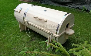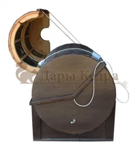 Горизонтальная двухрежимная фитобочка из кедра может быть использована как инфракрасная сауна и парная. Карбоновые излучатели отвечают за сухое парение и находятся на внутренней стороне дверцы. Влажное парение происходит за счет поступления горячего пара в фитобочку через паропровод. Горизонтальная форма позволяет принимать процедуры лежа. Внутренняя ручка из кедра облегчает открывание и закрывание двери во время парения. Такая модель наиболее удобна для оздоровительных центров.