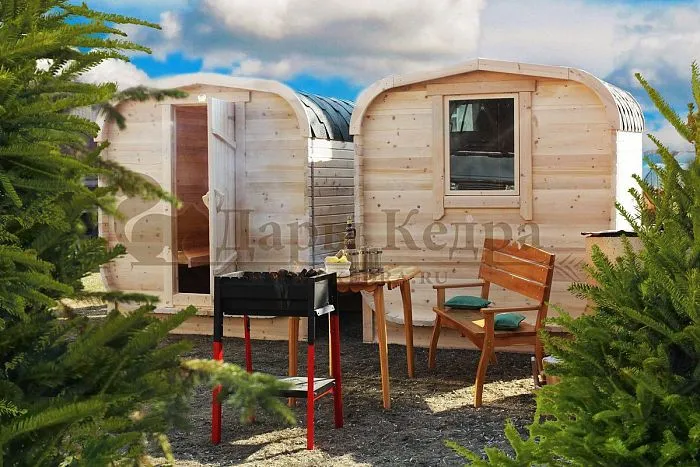 Оригинальное строение в виде бани-бочки, казалось бы, вообще не вариант для обустройства под дом. Но покажем наглядно, какими элементами можно дополнить раздевалку, чтобы баня в виде вагончика функционалом ничем не отличалась от летнего домика. Откидные столики, полочки, коврики, лежанки, зеркала и многое другое создадут уют, стены из кедра добавят тепла и оригинального древесного аромата. Кроме того, если парная выполнена в форме буханки, тут открываются необъятные просторы для дизайна и зонирования комнат для отдыха, спа-процедур. Ведь сама по себе такая форма бани предполагает увеличение пространства за счет ровного пола и увеличенной высоты потолков до 2,3 метра. На примерах уже завершенных проектов можно почерпнуть для себя идеи, добавить что-то свое и получится вполне оригинальный, комфортный дом для проживания летом. Если конструкцию утеплить на стадии строительства, то в таком домике можно проводить даже зимние вечера. Также стоит отметить, что такой дом-баня из кедра отличается не только функционалом, но и своей пользой за счет лечебной древесины кедра.